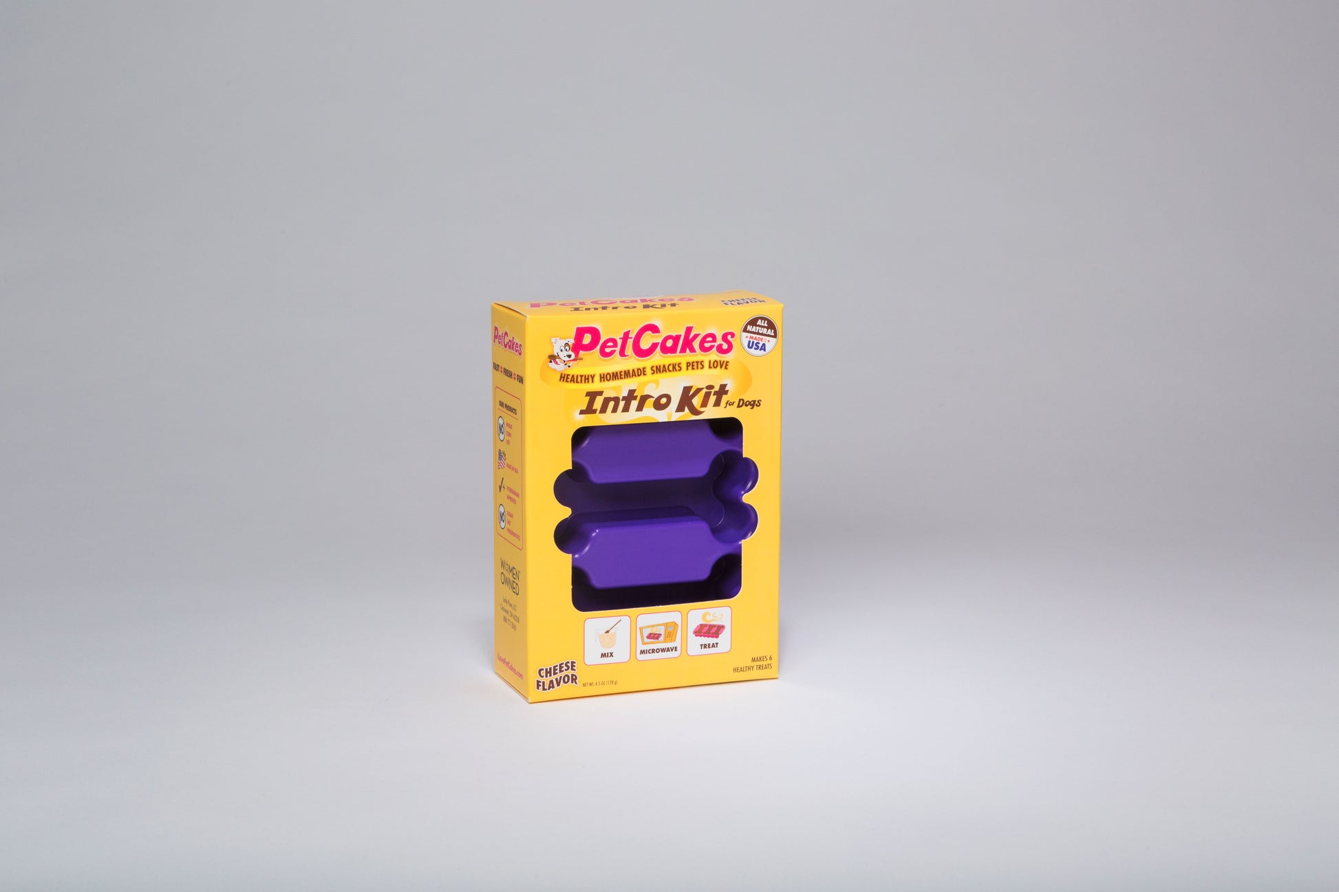 Make every day a special day with the healthy and delicious homemade PetCakes Intro Kit Cheese Flavor Microwavable Mix with Bone Shaped Pan Dog Treats (makes 6 treats). The first and only organic microwavable pet treats that are ready in minutes—just add water (and yogurt optional), pour the batter into the pan and cook for two minutes in the microwave. Comes with a re-usable three-bone pan, cheese-flavor mix your doggie will love. These all-natural treats are made in the USA with human-grade ingredients but still meant to be eaten only by your four-legged friend. The healthy mix makes six soft and yummy treats shaped like bones. Plus, it doesn’t contain corn, wheat, soy, salt, sugar or preservatives, so you can feel good about treating your pal any time of the year.